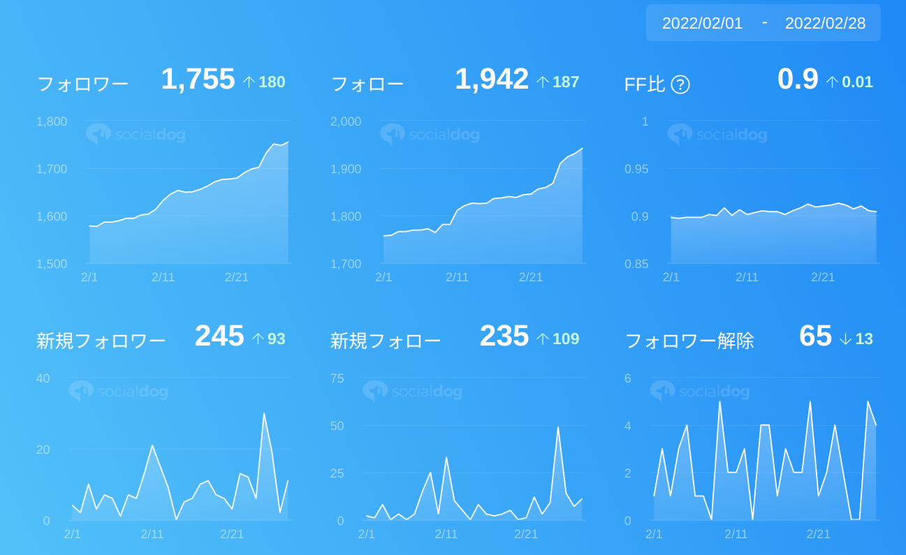 フォロワー180名プラス、フォロー解除人数が1月に比べ13名マイナスになりました。ツイートを作成する時間が確保できるので毎日投稿が担保されること。より多くの方のタイムラインに表示される型を守って投稿できたこと。いいね数の多かったメンバーにその時意識していたことなどを聞けたこと。Twitterコアタイムがあったからこそ、できたことが要因です。