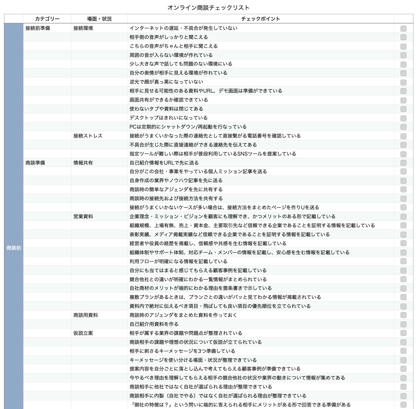 ※チェックリストの一部。商談前〜商談中〜商談後まで182個の項目が並んでいる。