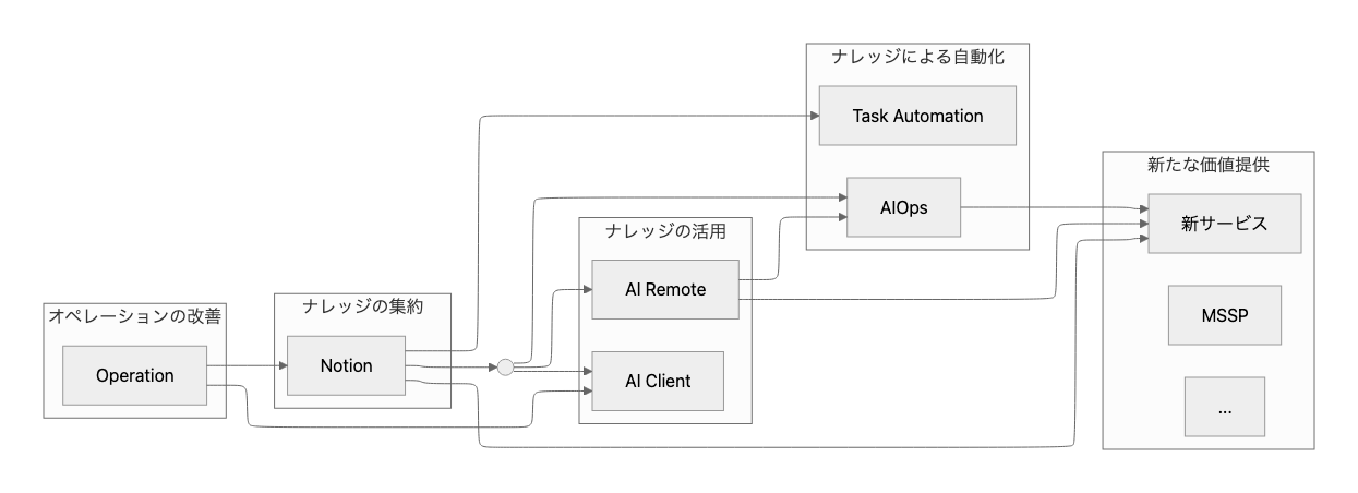 具体的には、お客様に開示する運用状況の拡充(もっとビジネスに寄り添った情報提供ができるのではないか)、より複雑な定常タスクの自動化、AIエージェントとの伴走、新たなビジネス価値の提供(これまで少数組織がゆえに人力で行えなかったサービス)などを考えています。