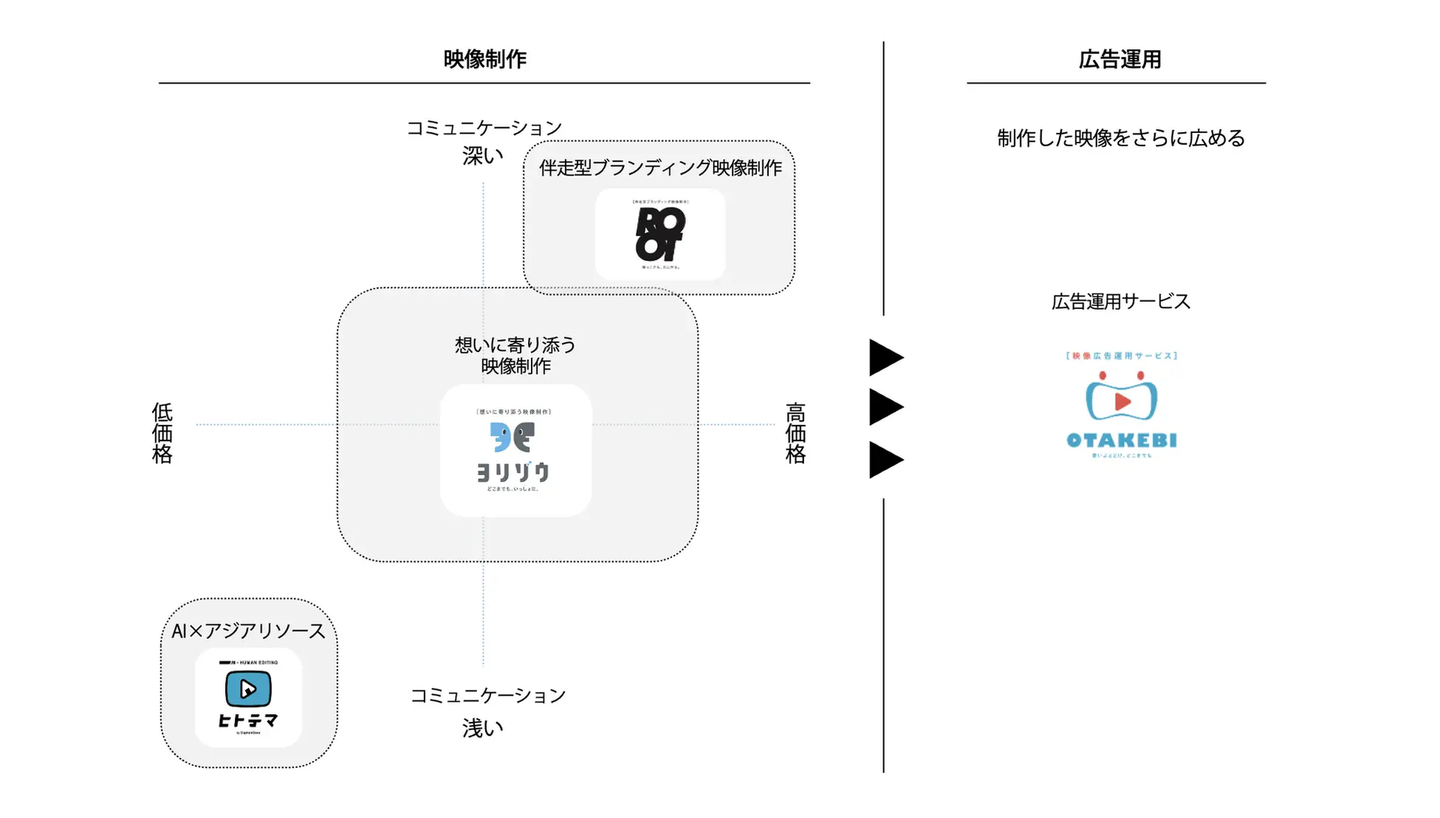 これまで、映像制作会社やサービスの選び方は「価格帯」が主な判断基準になっていたと感じています。そこで、弊社のサービス体制では価格帯を横軸で、コミュニケーション深度を縦軸で表すことで、価格帯だけではないサービスの選び方ができるようになっています。
