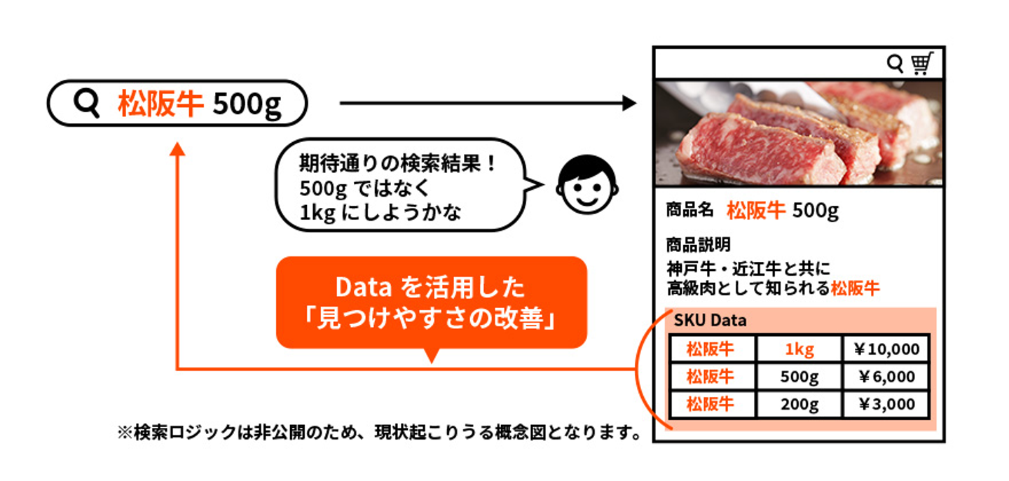 例えばグルメだとユーザーが「松坂牛 500g」と検索して商品ページを見に来たとします。