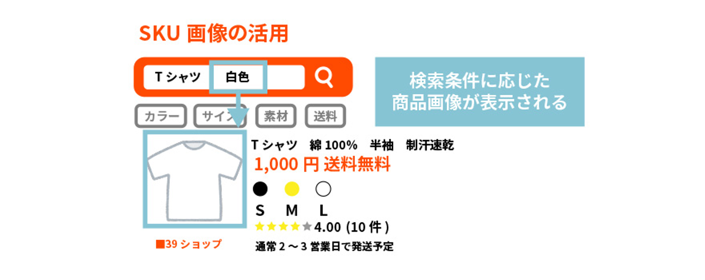 例えば「Tシャツ 白色」と検索した場合「白」のサムネイルが優先的に検索結果に表示されるので、ピンポイントで欲しい色の商品が購入できます。