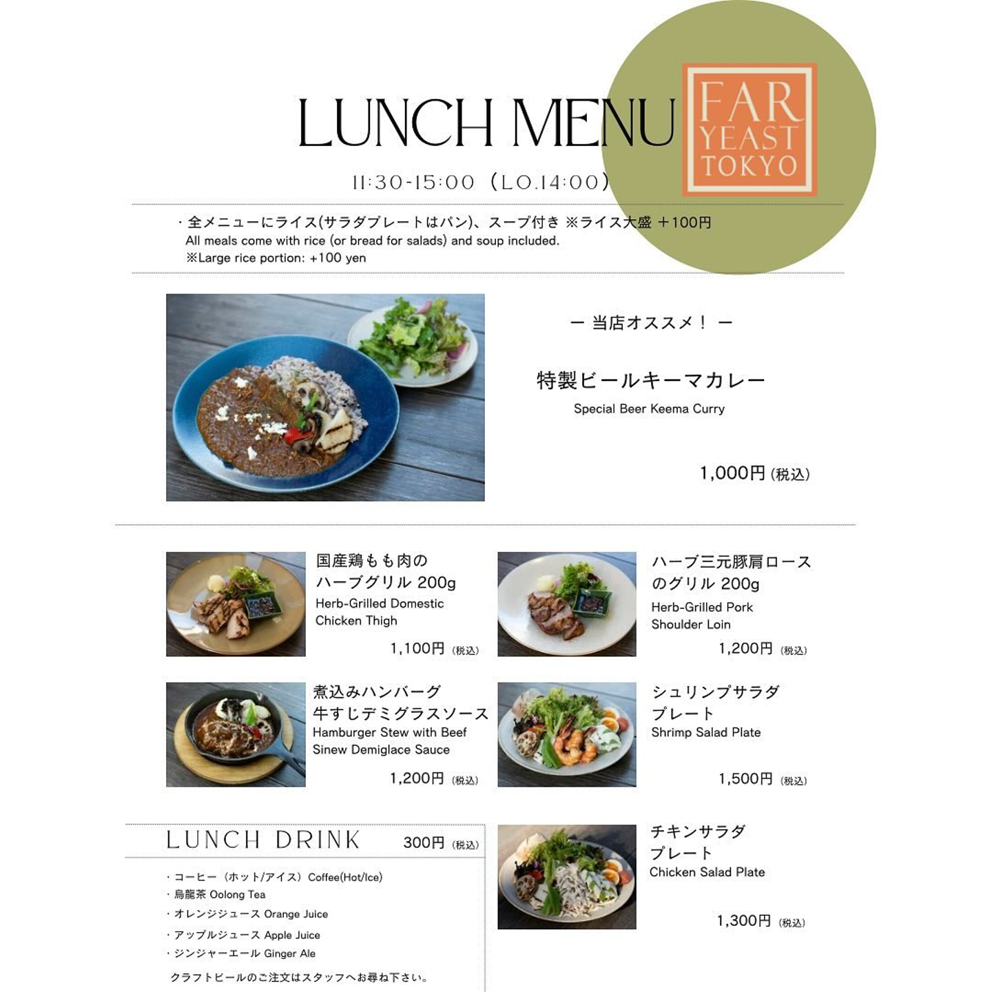 ドリンクとスープが付いて1,500円以下というコスパの良さも魅力的👏
