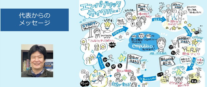 こんにちは。エンパブリックのスタッフの矢部です。エンパブリックで、どんなことをしているのですか?と聞かれると、なかなか明確に答えるのは難しいのですが(色々しているので…)、私の業務をみると、圧倒的に色々な人とコミュニケーションをしていることが多いと思っています。エンパブリックの理念は「思いのある誰もが動き出せ、新しい仕事を生み出せる社会へ」。それを実現するスキームとして「エンパブリック・サイクル」がありますが、その最初一歩は「自分の思いを口にする」です。地域で活動を立ち上げることも「思いを形にする」一つとなりますが、その一歩も、やはりまずは「やってみたいこと」「モヤモヤとしていること」を...