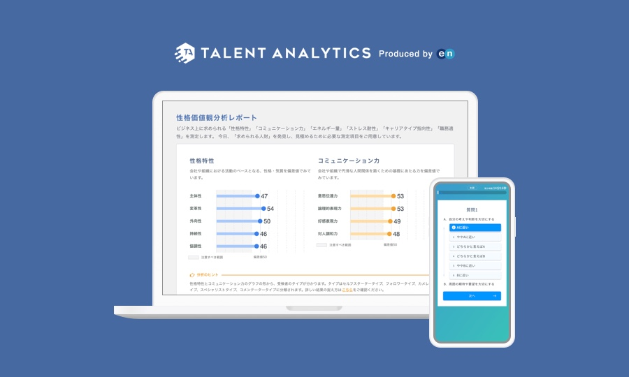 エン・ジャパンに入社して早9ヶ月、いろんなプロダクトのローンチを見届けてきました。たとえばオンラインで人材の性格価値観などを可視化する「Talent Analytics」。弊社の技術責任者である工藤(写真右)を中心に開発を進めました。