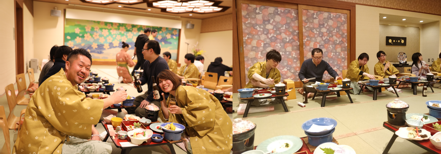 広いお風呂、綺麗なお部屋、美味しい料理、みんなで飲むお酒。出し物なんかはありませんが、普段あまり話せない人と話したり、黙々と美味しい食にを食べたりと、ここでも自由なことが多いですが、みんなで飲むお酒は、結局美味しいですね。