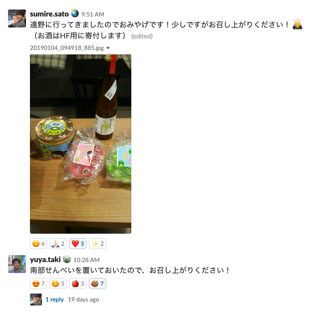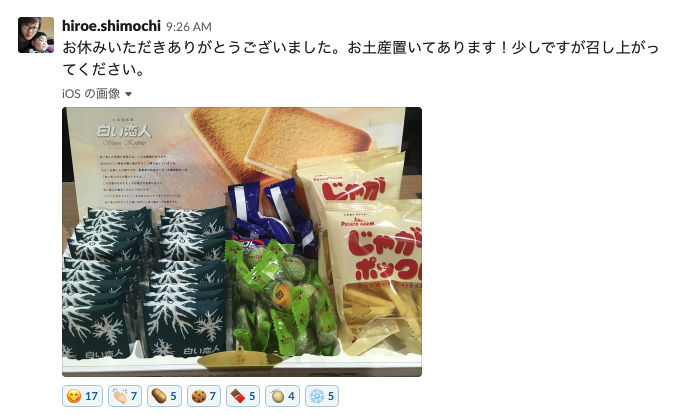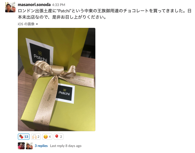 おみやげを買ってきてくれるひとがとても多いのですが、週明け、休暇明けは「お土産どうぞー」という書き込みであふれたり、