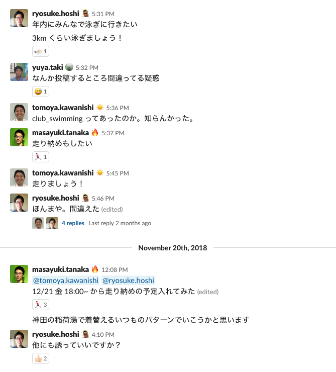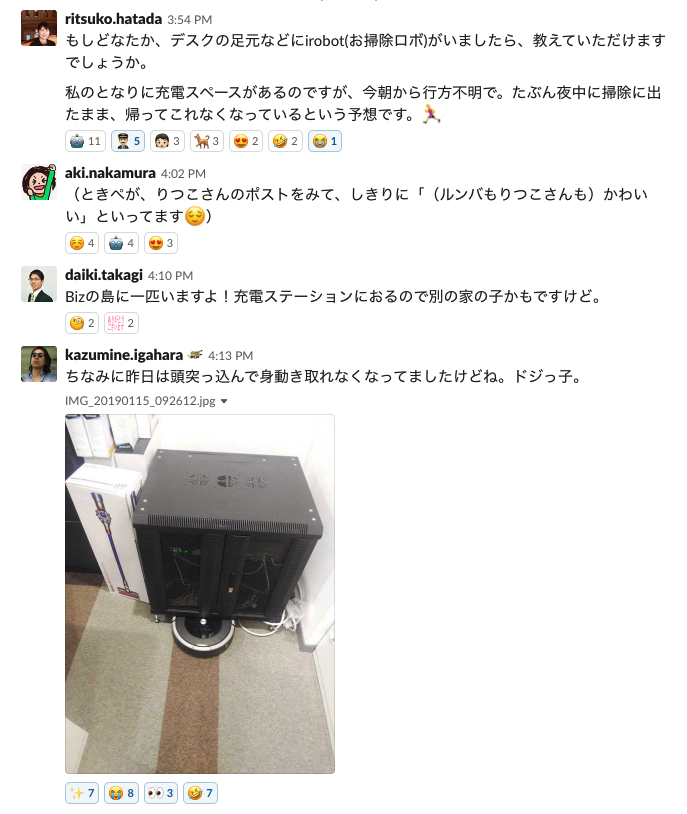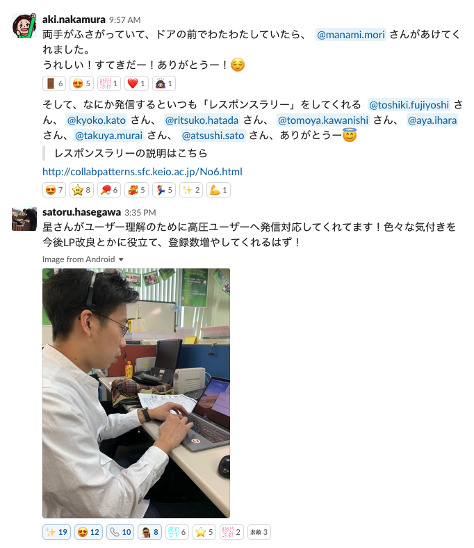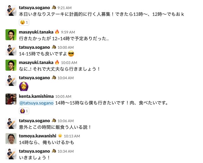 「この日までに書類の提出をおねがいしまーす」「ビルのメンテナンスで入館できませんー」「電車遅延で遅れますー」などの全社的な周知、「LPのデザインができました。お気づきの点、ぜひにー!」「先ほどの打ち合わせの議事録を書きました。ご確認くださいー」などの事業部やチームでの報告・共有・相談のほか、みんなでおしゃべりを楽しむことで、社内の円滑なコミュニケーションの一助にもなっています。