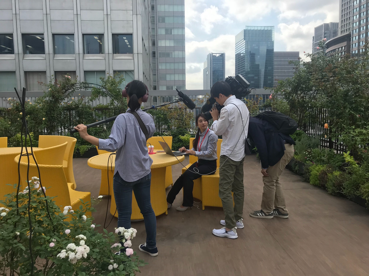 個人的にもお気に入りの屋上での撮影の様子です。実はすぐ真横が東京駅のため、新幹線に在来線と往来音が激し目でしたが、そこはテレビのプロの力で問題なく声も拾えていました◎