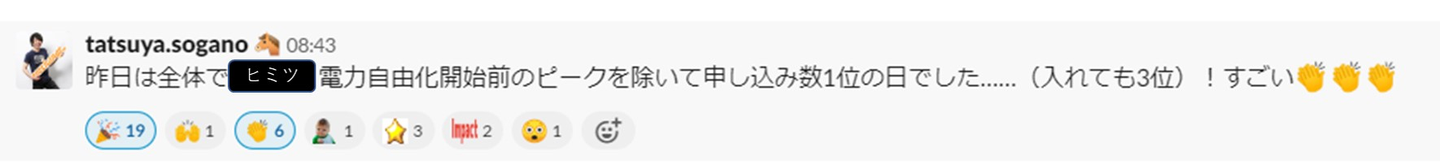 放送日の翌々日、電力・ガス比較サイト「エネチェンジ」を運営する事業部のスラックチャンネルで、事業部長から嬉しいお知らせがありました!
