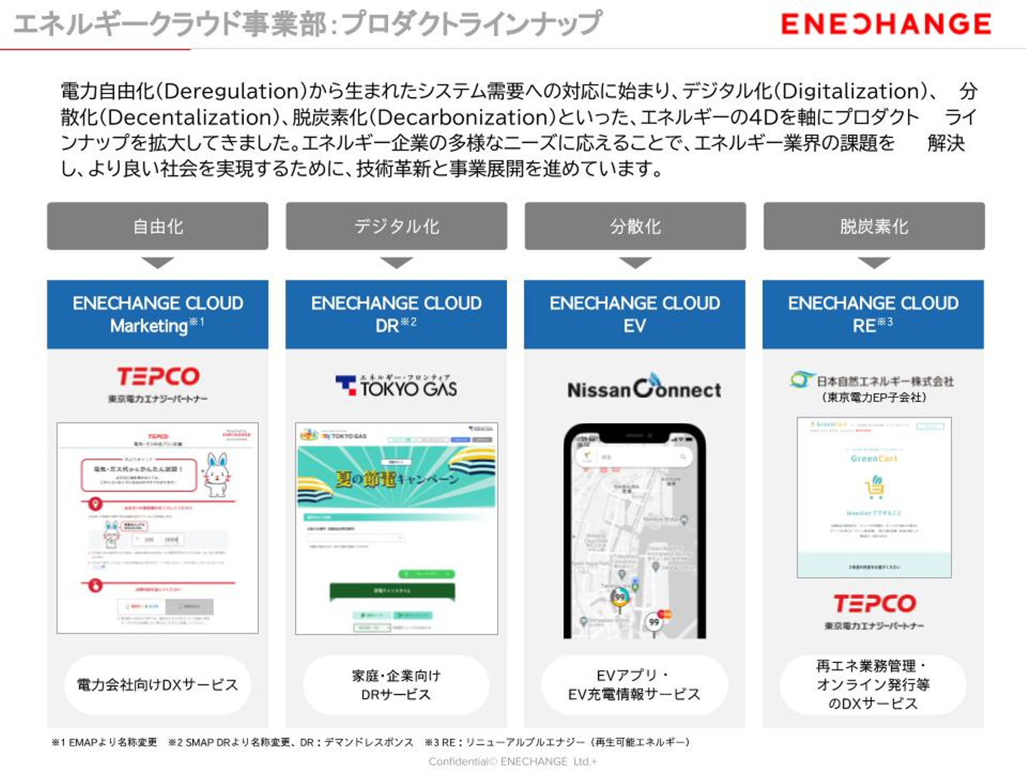 ENECHANGE(エネチェンジ)株式会社は、「エネルギーの未来をつくる」をミッションに掲げ、エネルギーの4D革命*を推進するエネルギーテック企業です。私たちの提供するプロダクトには「電気・ガス小売事業のマーケティング支援」「家庭・企業向けデマンドレスポンス(DR)サービス」「電気自動車(EV)ユーザー向けサービス」「再生可能エネルギー(RE)業務支援サービス」があり、これらのSaaSプロダクト群を「エネチェンジクラウド」として提供しています。
