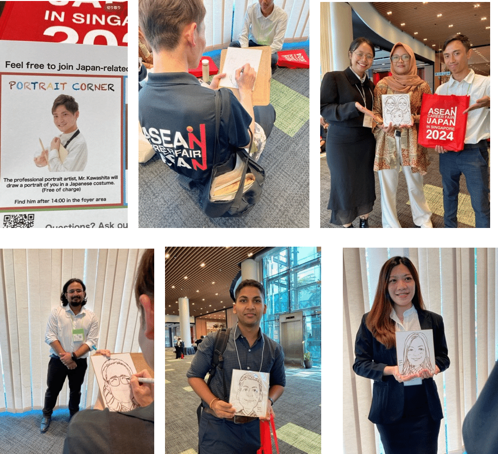 2024年イベントの新コンテンツとして、”ポートレート・アーティストの即興似顔絵イベント”がフリースペースで行われていた。日本企業への就職希望者だからか、”日本が好き”という人が多く、「あなたの似顔絵にお好みの和装を合わせて描きます」というサービスは、あっという間に長蛇の列となっていた。後から聞くと、全30人もの似顔絵を描き上げたそうだ。仕上がった絵と一緒に写真に収まる求職者たちはみんな笑顔で、本当に楽しんでいる様子が見てとれた。