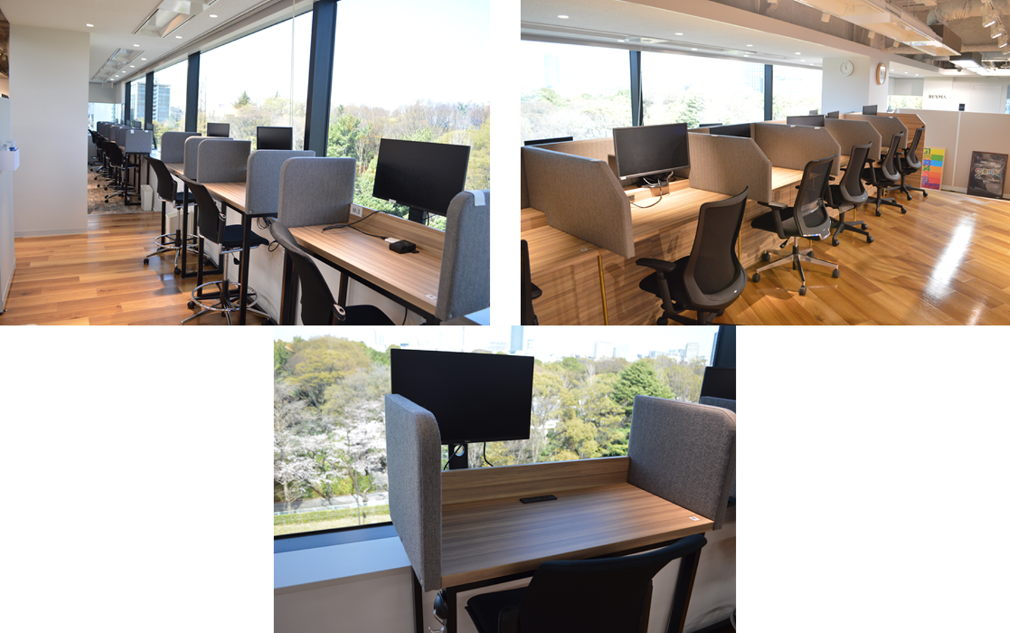 開放感ある窓に面した席は、赤坂御所を眺めながら快適に業務ができます。こちらもデュアルモニターを完備しております。また、ソーシャルディスタンスを確保する距離感で席が配置されています。