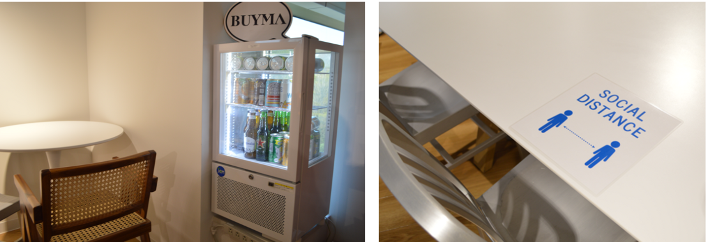 ちょっとしたコミュニケーションスペースです。出社したメンバーが自然とコミュニケーションを取れるように設置。休憩したり、ランチを食べたり、息抜きに使えるようなエリアでもあります。感染対策のルールとマナーを社内で啓蒙しています。