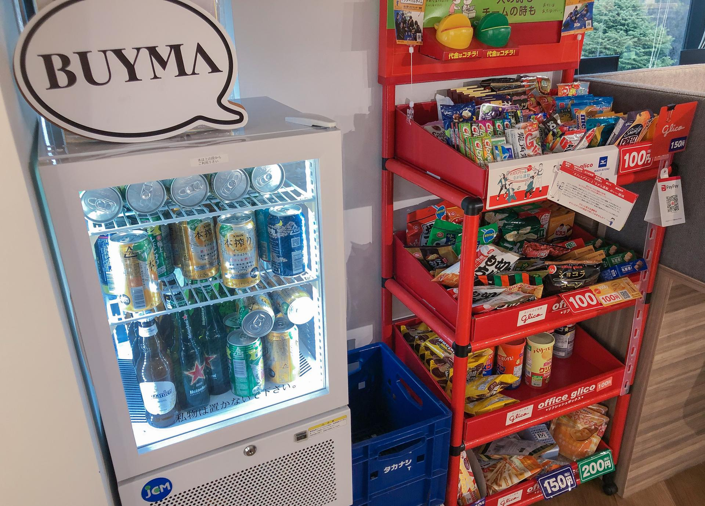 (社内のビール・アルコール用冷蔵庫とオフィスグリコ)