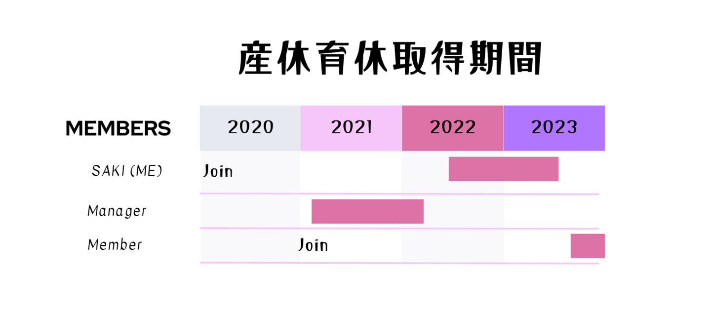 私が入社(2020)→ 社員メンバーの入社(2021年)→マネージャー産休にあたり私がマネージャー職を引き継ぎ (2021年)→ マネージャーの復帰、私の産休開始でマネージャー職をお戻しし業務を社員メンバーに引き継ぎ(2022年)→ 私の復帰、社員メンバーの産休開始(2023年)という流れ。
