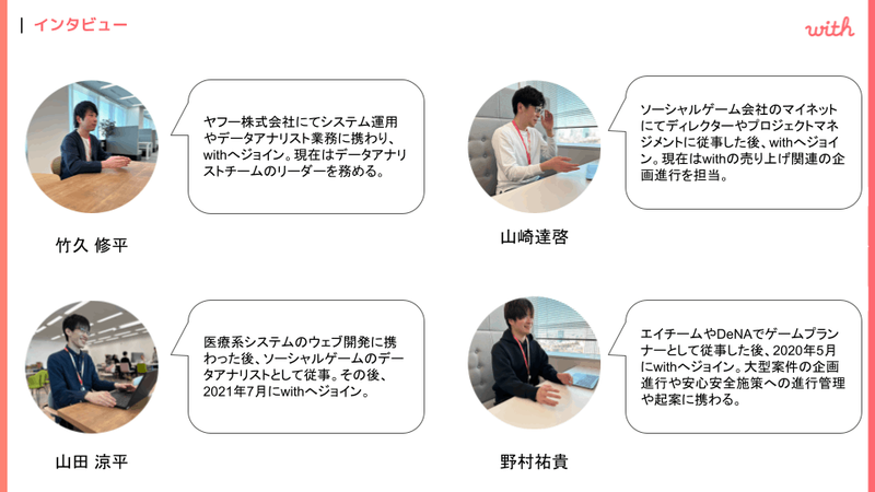 データアナリスト 竹久さんにインタビューした際には「withのデータアナリストは他ポジション(職務)のメンバーとの連携が多く取れるところが魅力」であると伺いました。(インタビュー記事はこちら)