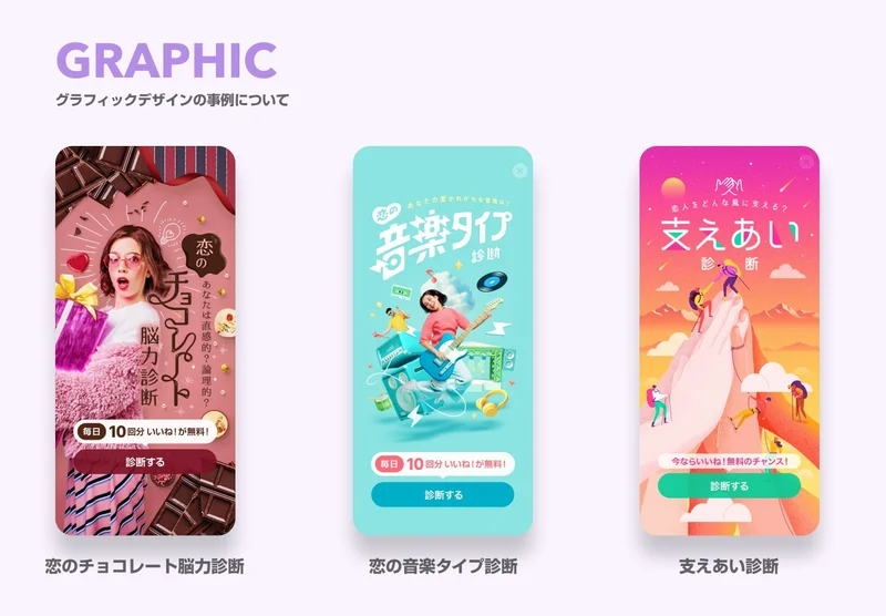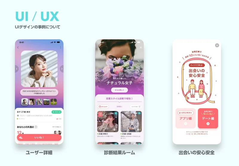 「使える」ではなく「使いたい」と思ってもらえるように、サービスに変化や遊び心を加えワクワクするデザインを追求しています。独自コンテンツである心理テストを通じて、自己発見できる楽しさや価値観が一致する相手と出会えるワクワク感をユーザーに提供することで、サービスに唯一無二の魅力が生まれ、「使いたい」と思ってもらえる理由になると考えています。