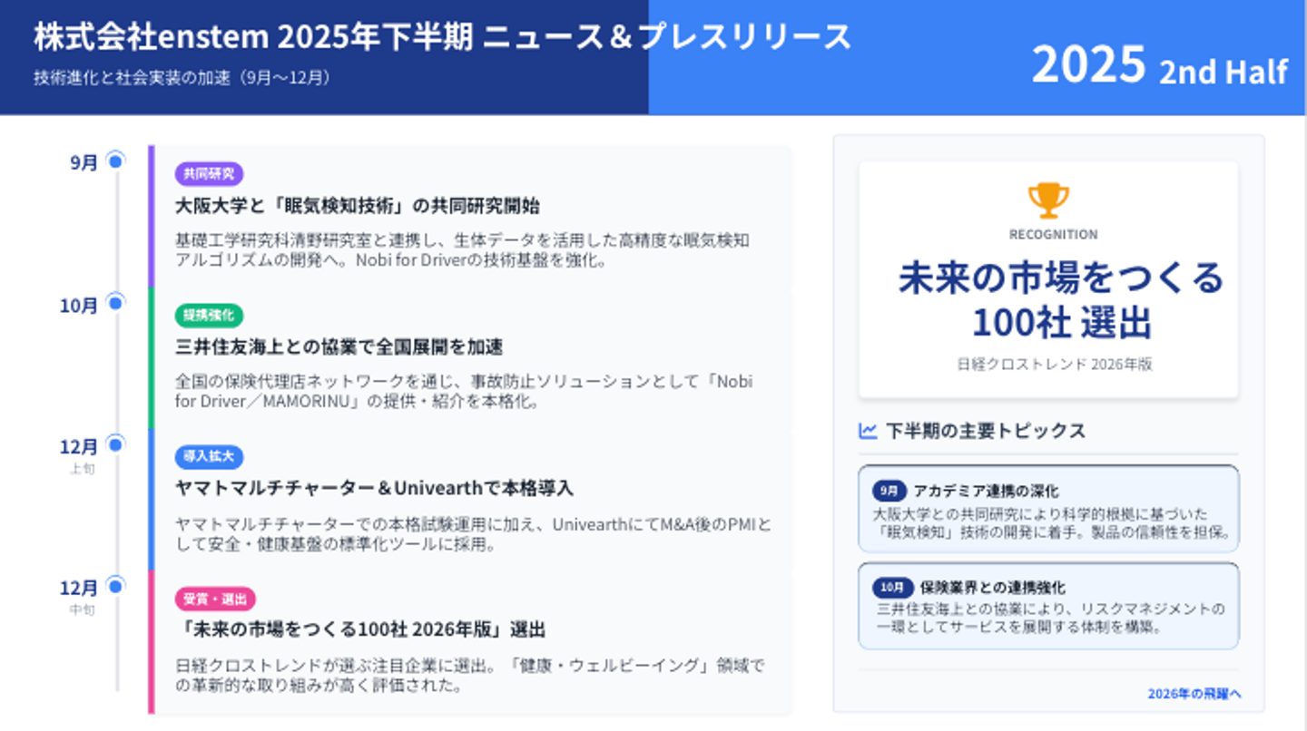 2025年度は、enstemが掲げる「人の"いま"を可視化して、事故ゼロへ」というビジョンが、より具体的な形となって社会に実装され始めた年でした 。