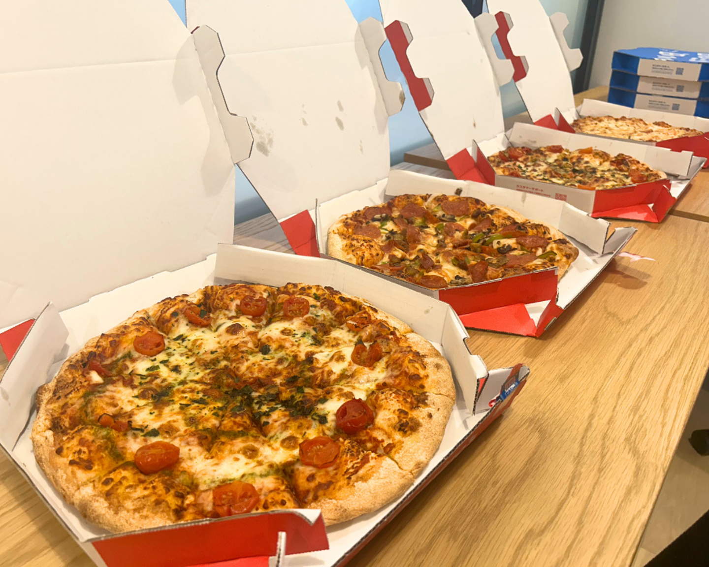 夕方、就業後のオフィスにデリバリーピザが到着し、業務を終えたメンバーが自然と集まりました。