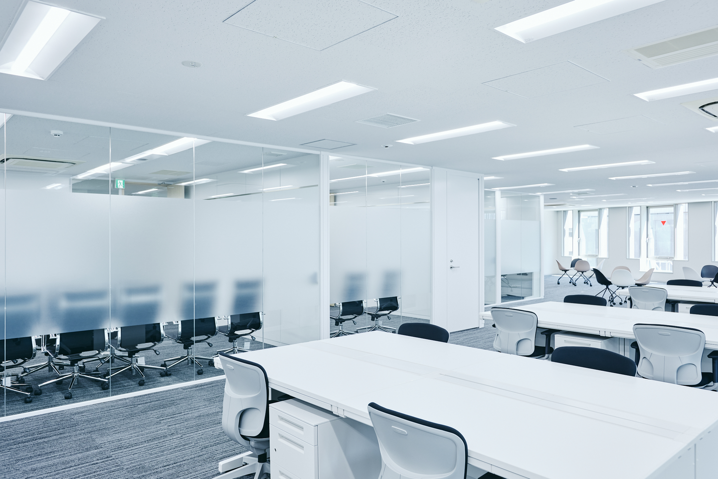 またエントランスと同じく白を基調にしたデザインになっています。MTGスペースもガラス張りになっているので解放感があり、個人的には快適に仕事ができる環境だと感じています。右奥に見えるリフレッシュスペースでは休憩を取ったり仕事をする場所を変えたりして気分転換をしていただくことも可能です♪