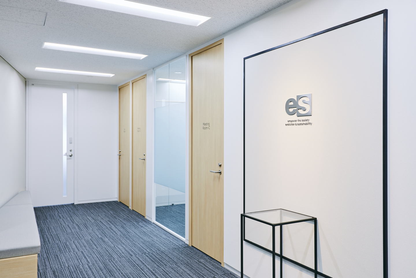 エレベーターを降りるとすぐにエントランス&来客用MTGスペースが!MTGスペースは様々なディスカッションに対応できるように全てのお部屋にホワイトボードやモニターを完備!