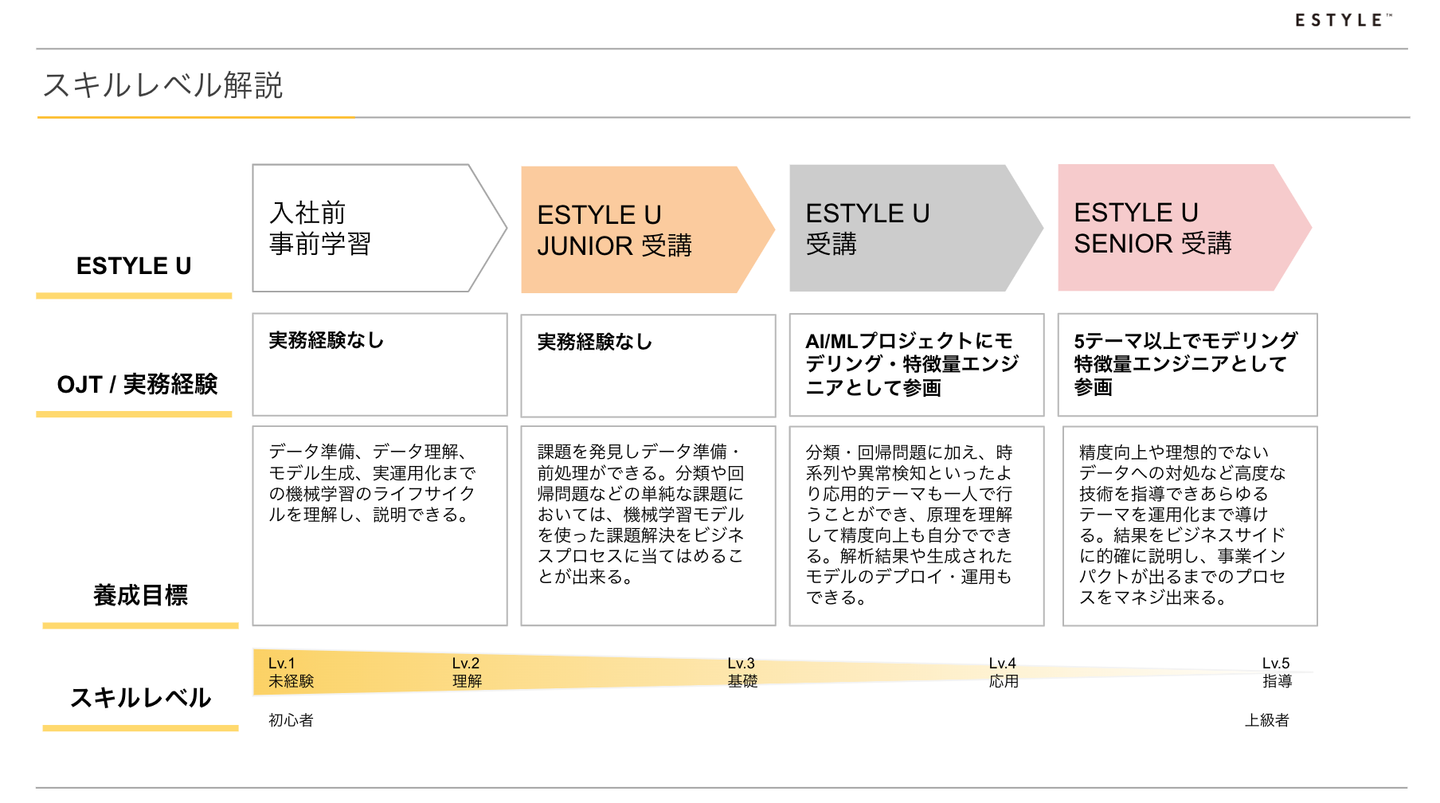 エスタイルでは、未経験から一人前のデータサイエンティストに成長できる教育プログラム「ESTYLE U(エスタイル ユニバーシティ)」を設けています。