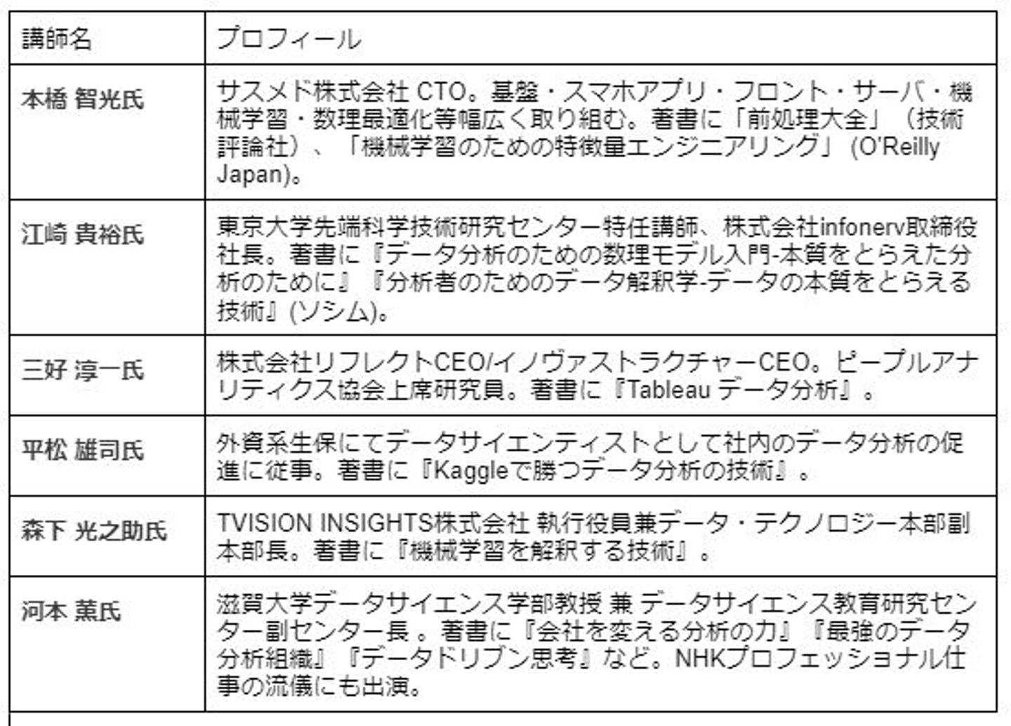 これは、業界を代表するデータサイエンス関連書籍の著者をゲストに招聘し、1年間を通してデータサイエンティストに必要な知識を幅広く学習する教育プログラムです。