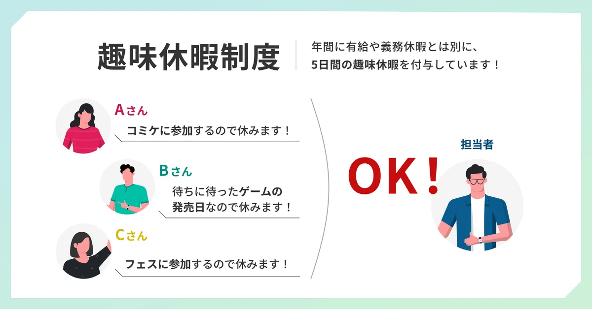 仕事と同じようにプライベートも大切にして欲しいと思い、この休暇制度を設けました。