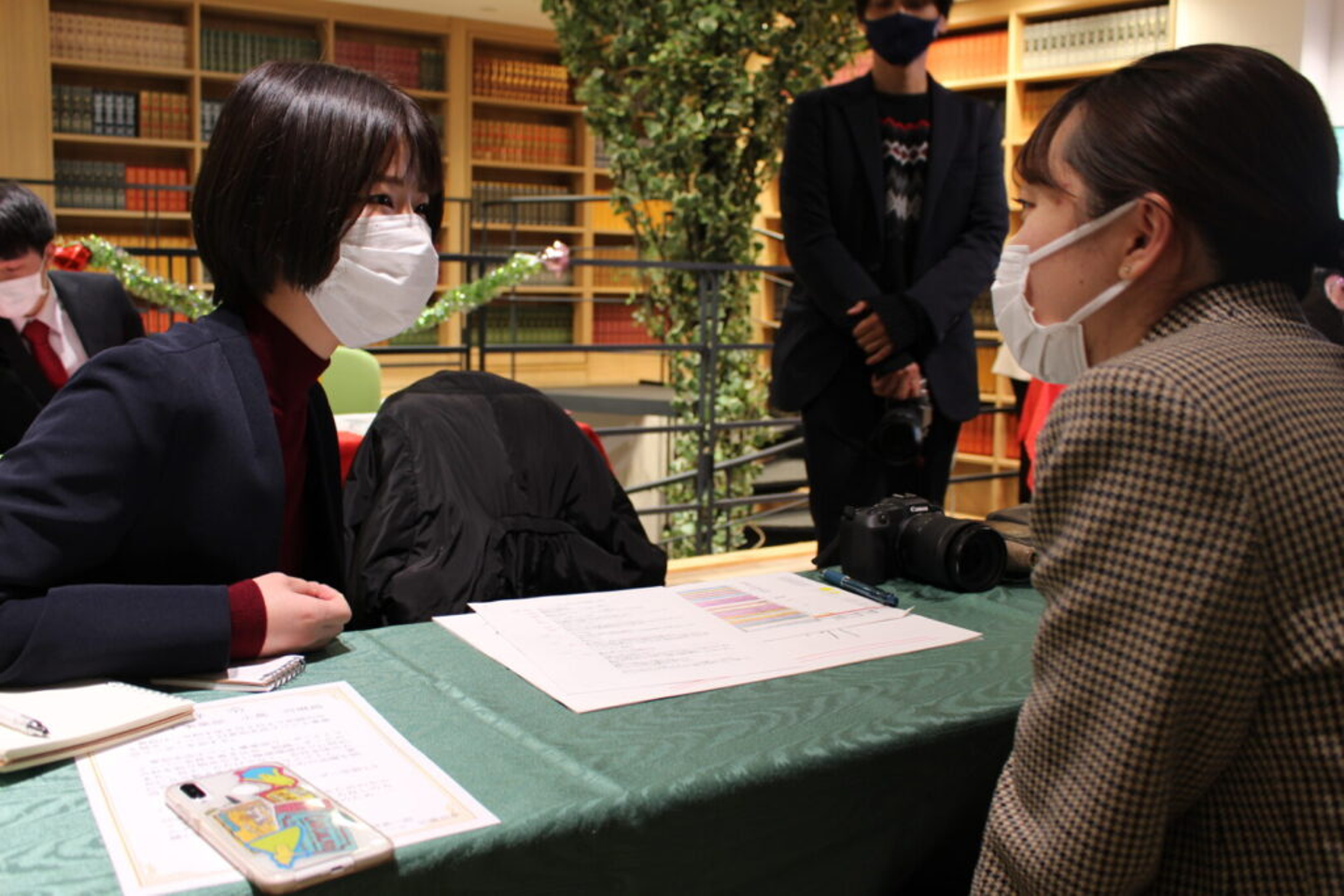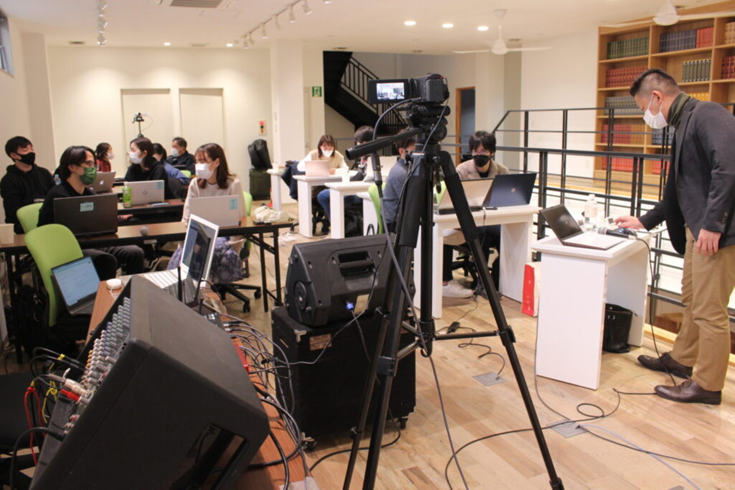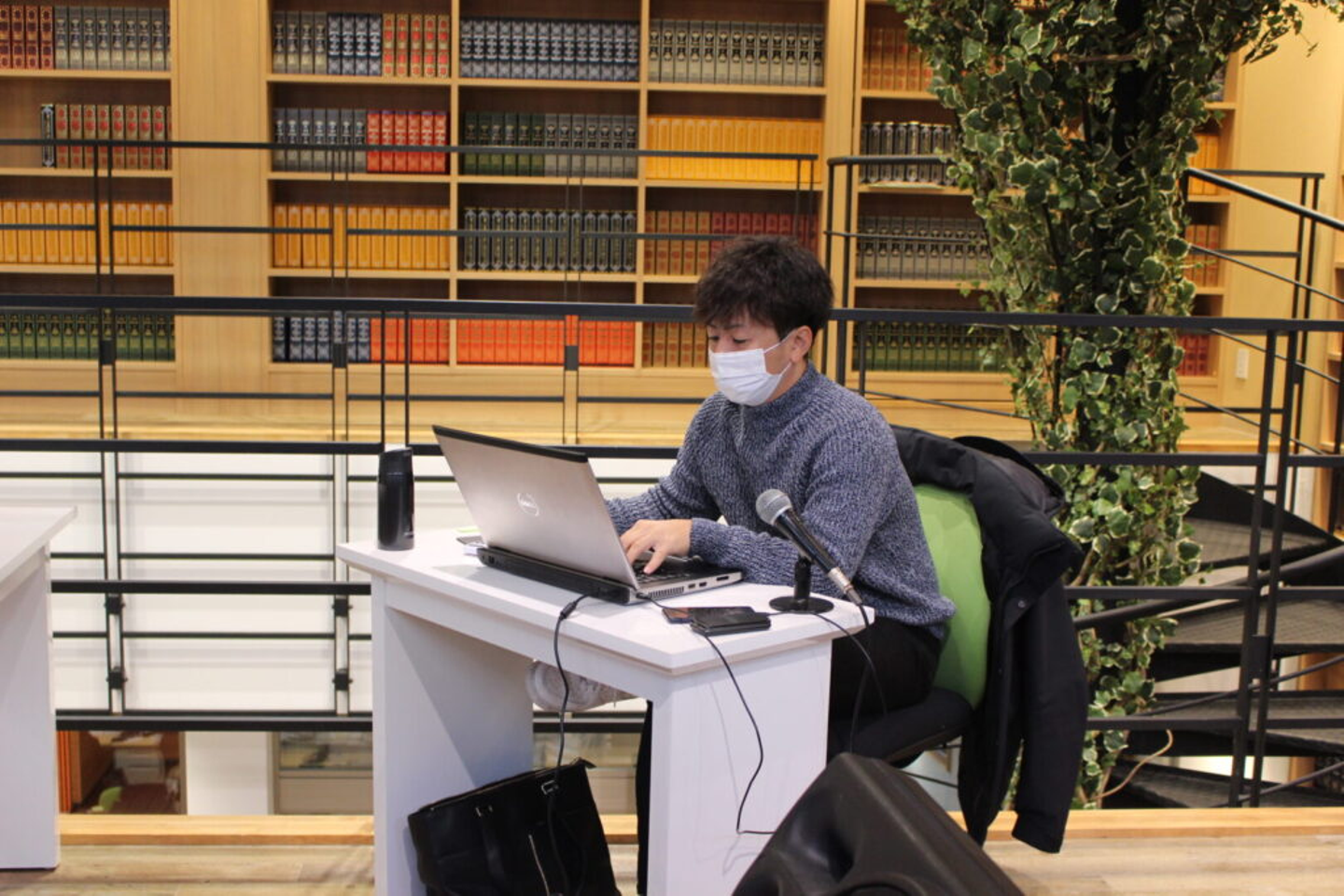 背景となる壁一面の本棚が写真映え。全体の様子を見ながら話せるように司会者の席を用意しています!