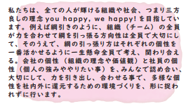 すべての人が輝ける組織や社会にしていくためのそれぞれの個性を活かして輝かせるように理念の実現の元広げていけるものです。もっと詳しく説明をみていくとこうなります