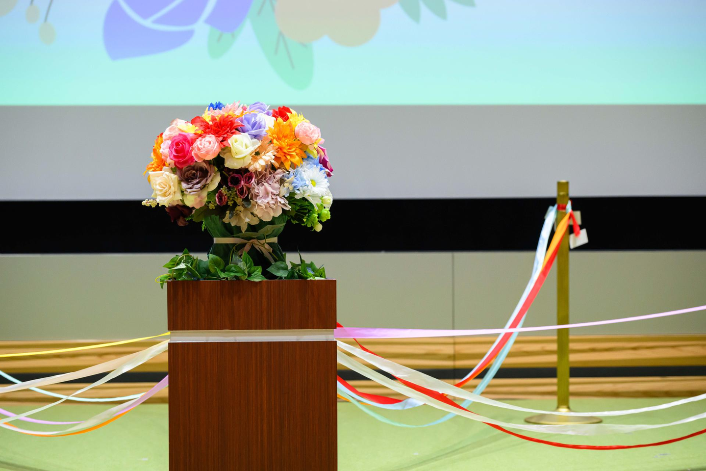カラフルなリボンに書かれた先輩からの応援・お祝いメッセージを受け取り、