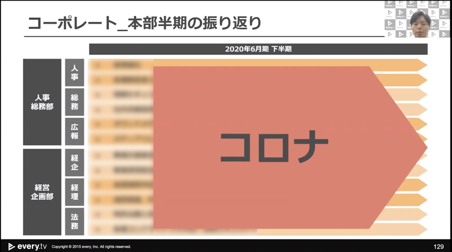 この半年のコロナ禍での対応を振り返り、突発的な事態にも速やかに対応をしてくれたコーポレート本部メンバーや、刻々と変化する状況に合わせて柔軟に対応してくれた全メンバーへの感謝を語りました。