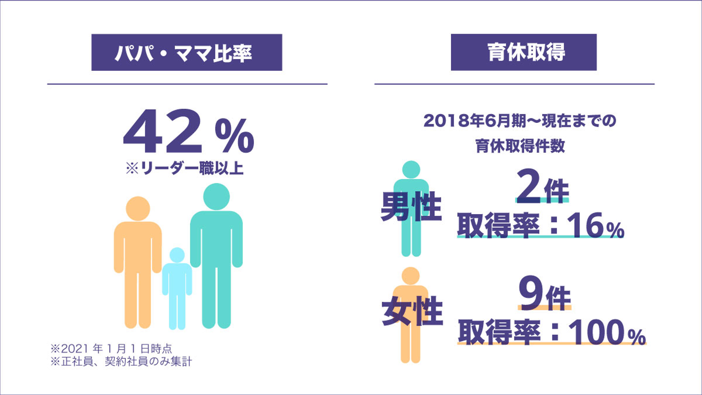 菅原:例えば、こちらは育児・子育てに対するエブリー従業員の状況をまとめたものです。まずリーダー職以上のメンバーのうち、パパ・ママ比率(お子さんがいらっしゃる比率)は42%でした。過半数には満たないですが、多くの方が育児・子育てに励みながらエブリーの会社を引っ張るポジションを担っています。