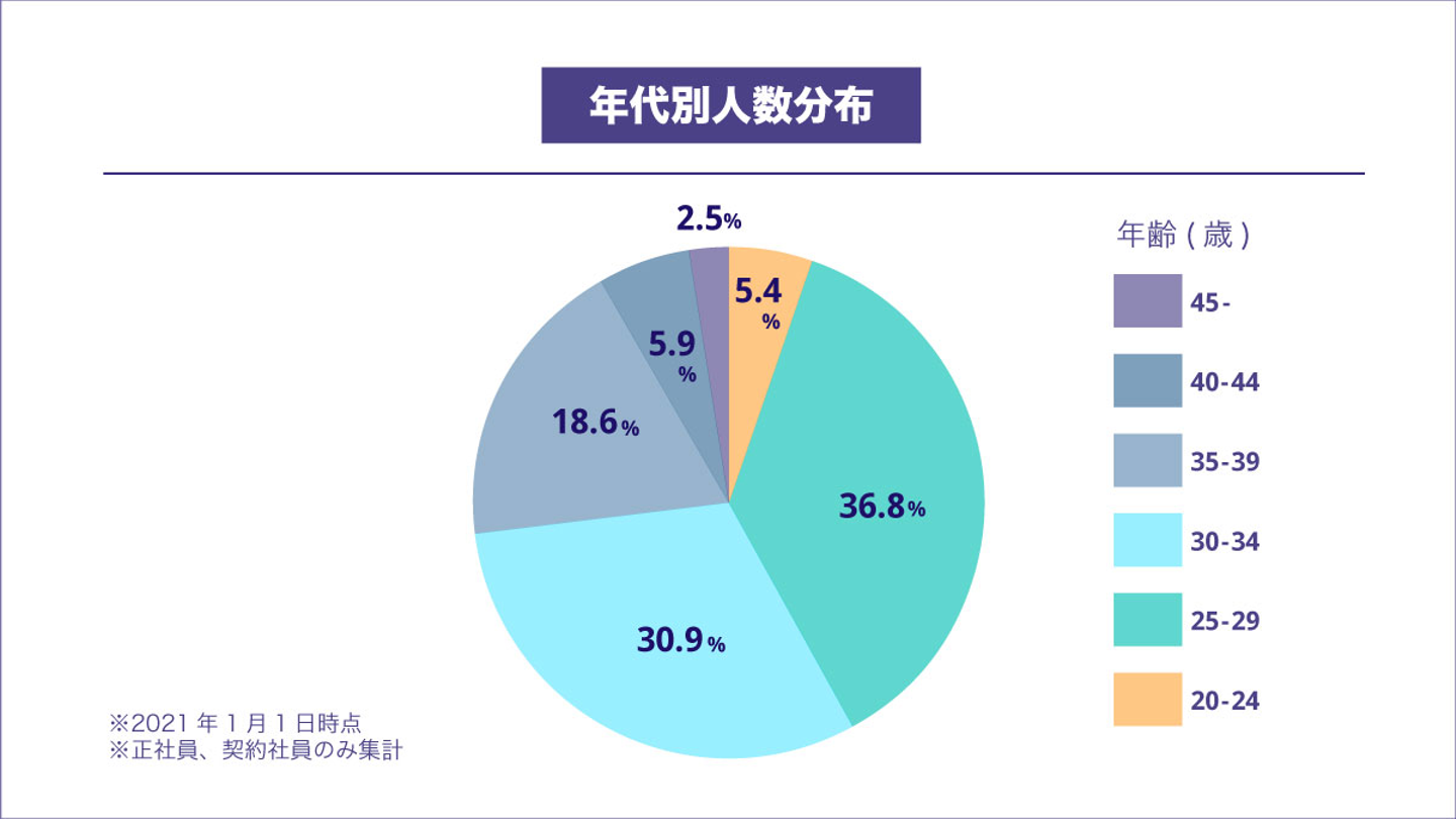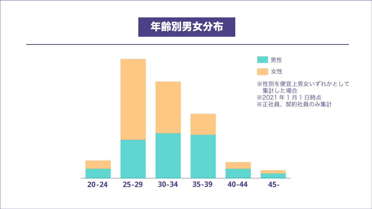 山本:年代別に男女比率を見てみると、25-29歳の年代では女性が多く、35歳以上の各年代では男性の割合が多くなっています。年代によって多少の偏りはありますが、全体でみると47:53とバランスが良いと考えています。