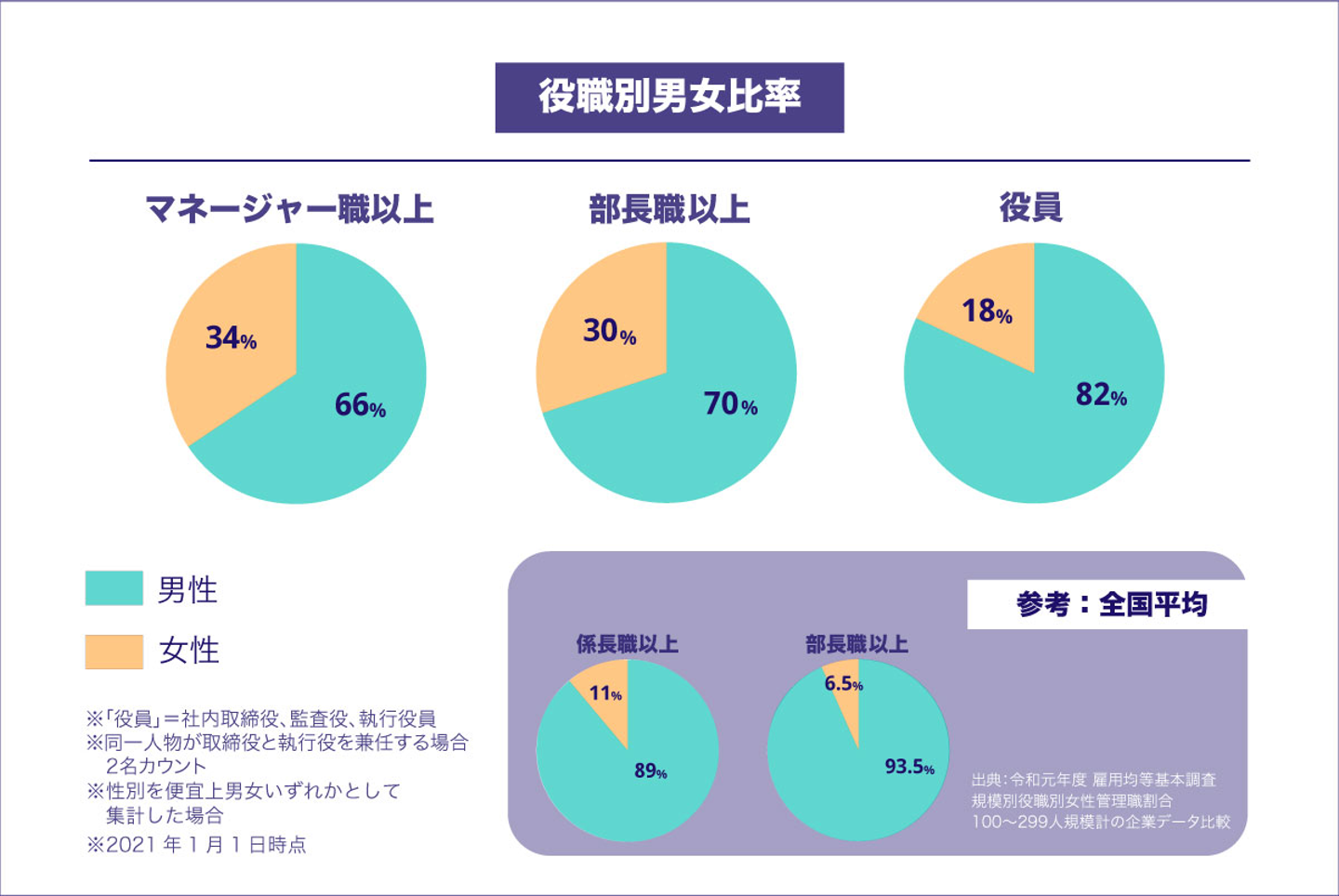 日本でも政府が男女共同参画社会の後押しをしていて、「女性の管理職比率を2020年までに30%にする」といった目標を掲げていました。全体では目標数値に到達することなく終わったそうですが、エブリーでは女性の管理職比率34%と、この目標数値を達成することができています。