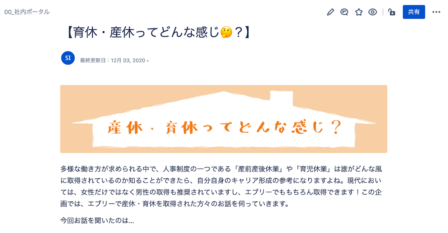 あとは制度を作るだけではなく、制度を使いやすい雰囲気を作ることも非常に大事だと考えていて、エブリーでは様々な働き方を支援するため、「every.one」という社内報にて様々なメンバーのインタビュー記事を公開しています。社内のメンバー全員がアクセスできる場所で、様々な働き方を紹介することで、多様性への理解と浸透を促進していくことが目的です。「every.one」ではすでに産休・育休制度について取り上げているのですが、これまでのインタビュー対象が女性ばかりだったので、男性にもインタビューをして男性の育休取得率を向上させていきたいと思います。