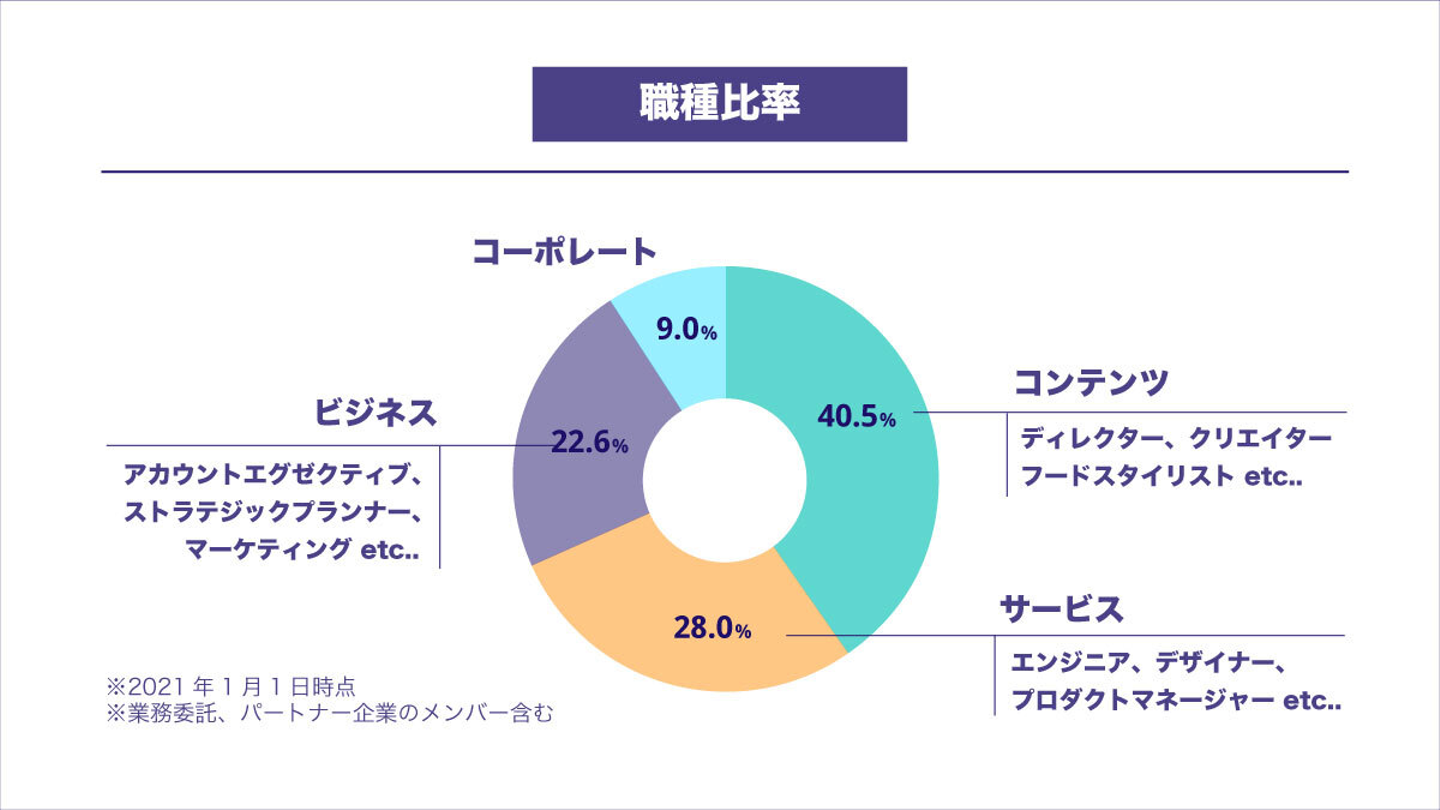 山本:職種別の比率も公開します。最多カテゴリは全体の4割を占める「コンテンツ」で、『DELISH KITCHEN』、『MAMADAYS』、『TIMELINE』それぞれの動画コンテンツの制作に携わるメンバーを指しています。高い品質のプロコンテンツは私たちの事業の根幹であり、強みの部分です。例えば、レシピ動画を配信している『DELISH KITCHEN』では、管理栄養士などの資格を持つたくさんのフードスタイリストが「食のプロフェッショナル」としてコンテンツの制作に携わっています。