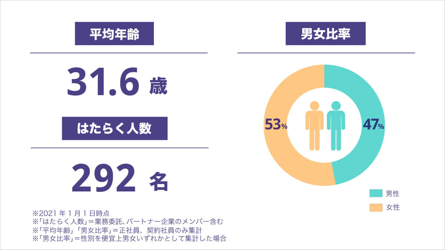 山本:まずはエブリーの全体像ですが、平均年齢は31.6歳、従業員数は292名、そして男女比が47:53です。年代別の人数分布を見ていくと20代・30代が圧倒的に多く、全体の9割以上を占めています。特に、25歳〜34歳までの年代は全体の67%で、ボリュームゾーンとなっていますね。