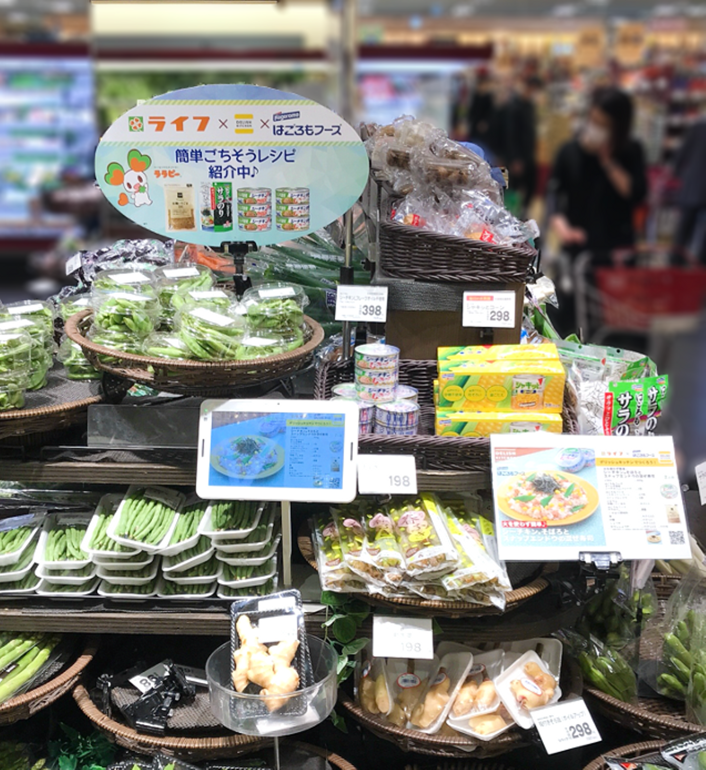 生鮮食品エリアの外路地に「ストアビジョン」を設置し動画レシピを配信。シーチキンをレシピ内の商品と合わせて陳列しました。