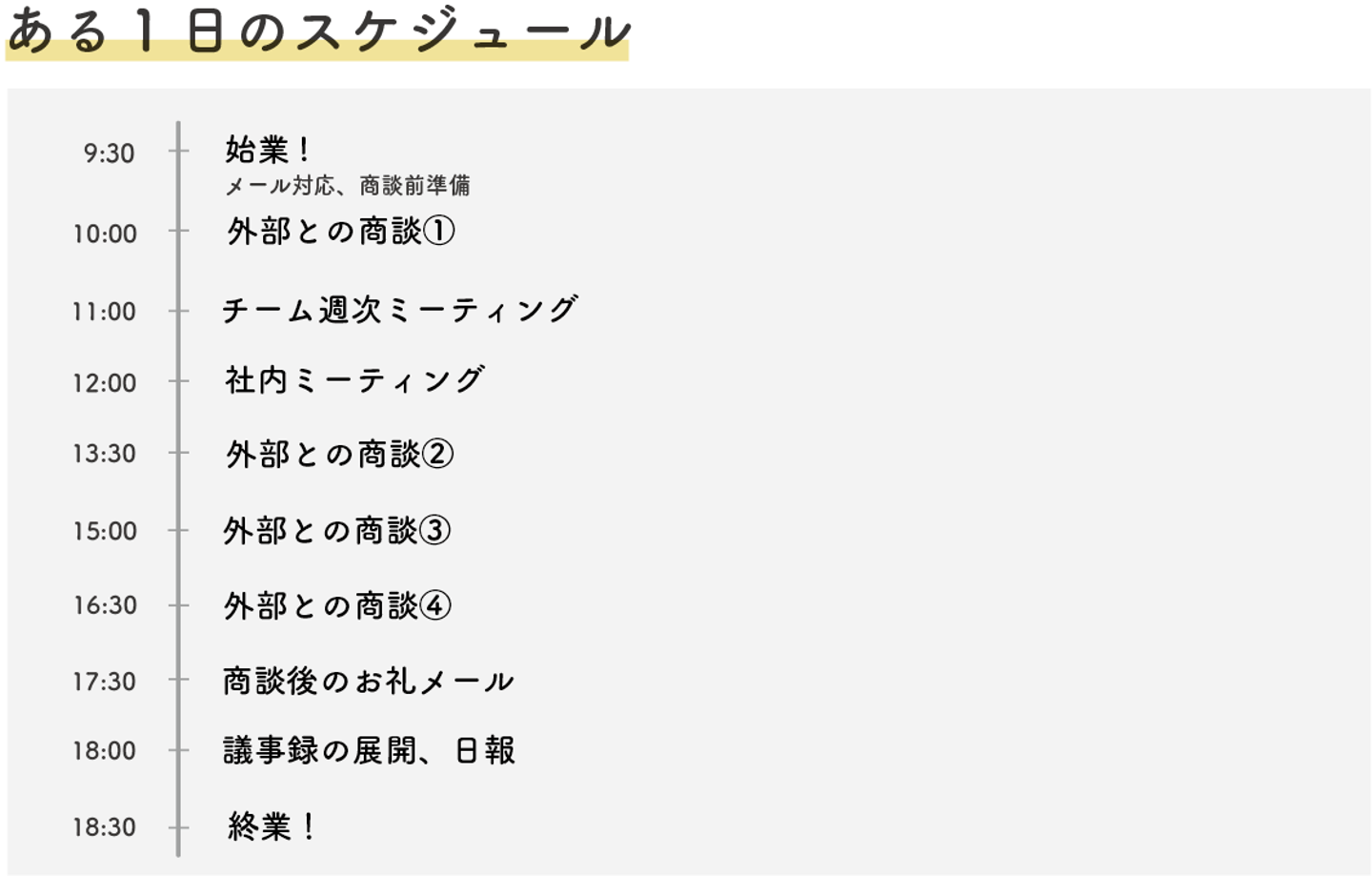 商談は1日に平均2〜5件あるのですが、事前準備は怠らないようにしています。また、合間にはメールの返信や翌週以降の商談打診、事務作業など業務量が多いので、優先順位をつけて対応するようにしています。