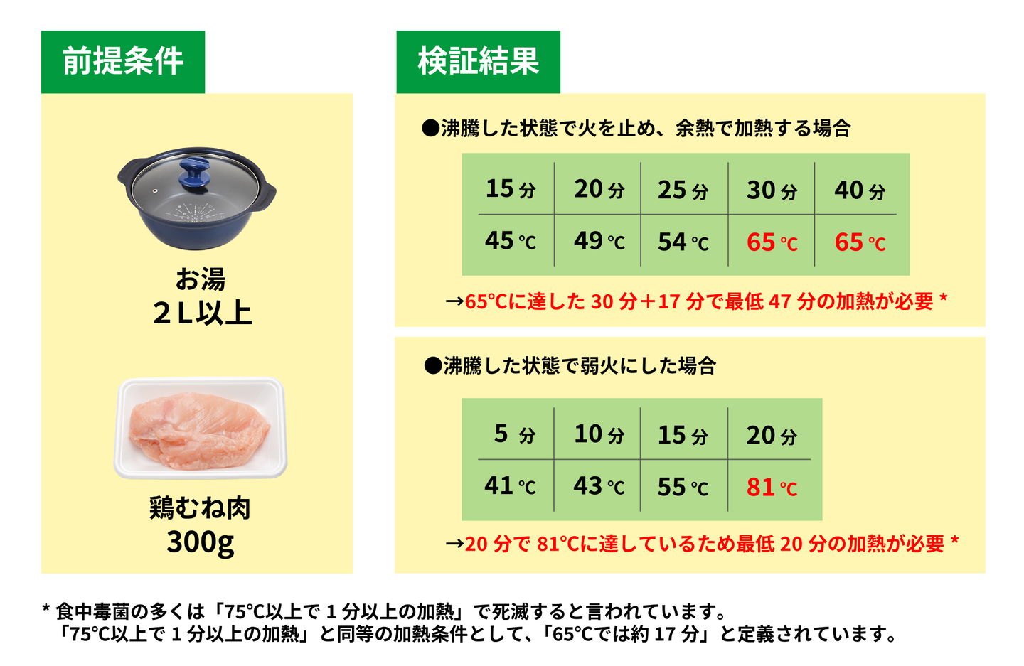 肝心な加熱時間については実際にフードスタイリストが検証を行いました。厚生労働省からは食肉の加熱条件について、中心部を75度で1分間加熱か、それと同等の加熱が必要だとしています。とはいえ、前述したように調理用温度計がないご家庭も多いので、お肉の中心部が75度の状態になっているかを確認するのは難しいですよね。そのため「沸騰水に保温した場合」と「沸騰水に入れて弱火にし続けた場合」に分けて、それぞれ何分間お肉を入れたら中心部が75度で1分間加熱されるのと同等になるか、検証を行いました。
