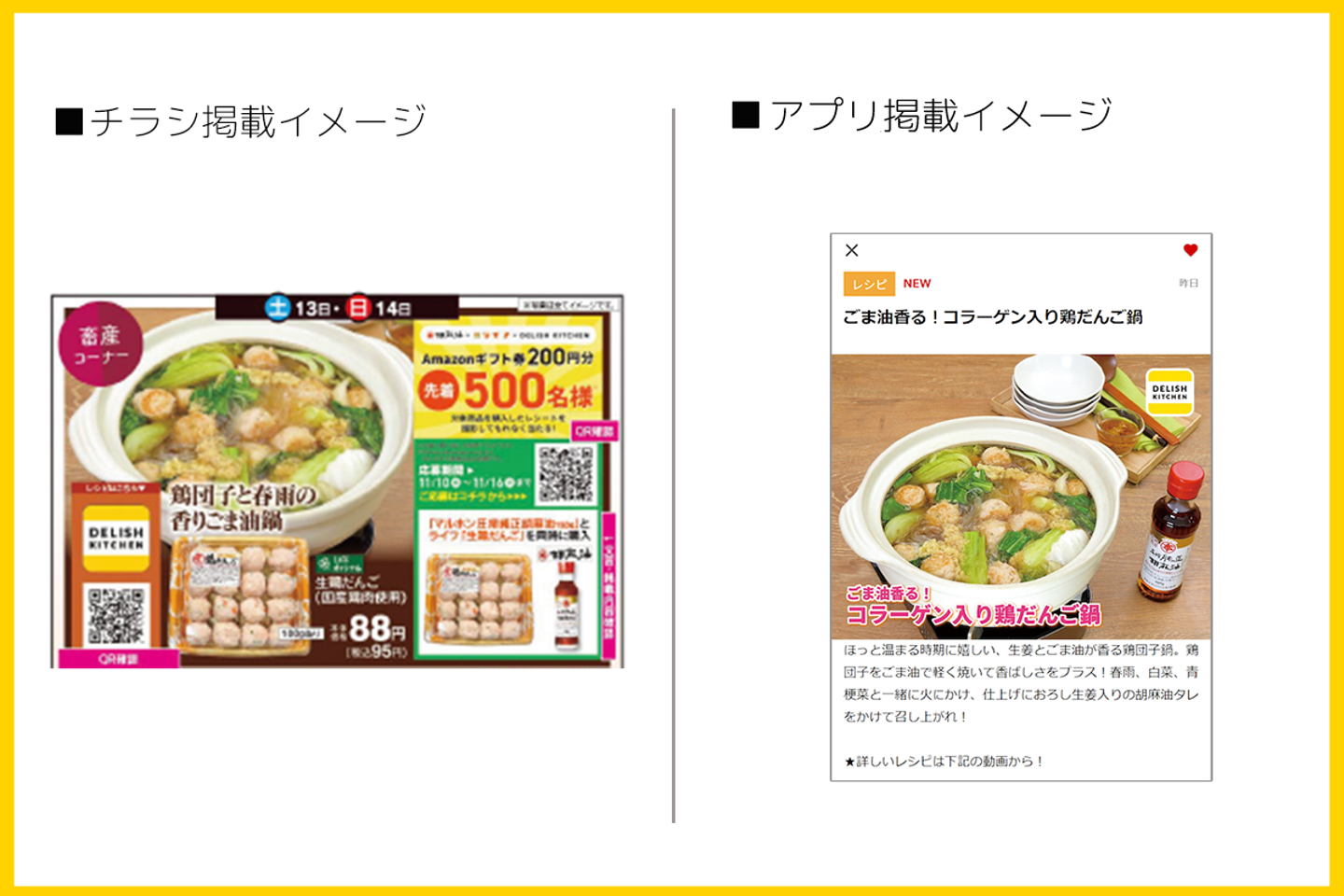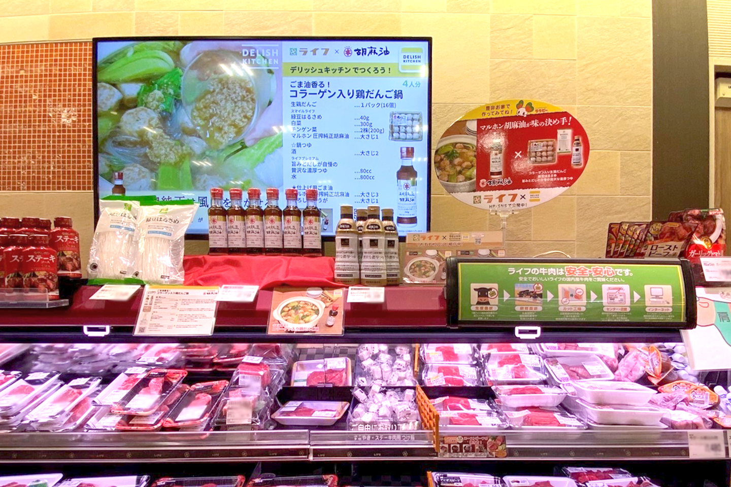 川村:お取り組みの内容としては、「マルホン胡麻油」ブランドを展開する竹本油脂様の「圧搾純正胡麻油」とライフ様のプライベートブランド(以下、PB)商品である「生鶏だんご」「緑豆はるさめ」「贅沢な濃厚つゆ」を使用したレシピ動画を作成し、『DELISH KITCHEN』のアプリ内に掲載・サイネージでの配信を行いました。加えて、関東を中心としたライフ様の店舗の畜産コーナーにて一体陳列での販促、ライフ様のチラシやアプリへの掲載まで行っていただきました。また、当社のマーケティングチームとも連携し、商品を同時購入した際のレシートの写真を撮って応募するとAmazonギフト券が当たるキャンペーンも初めて実施しました。