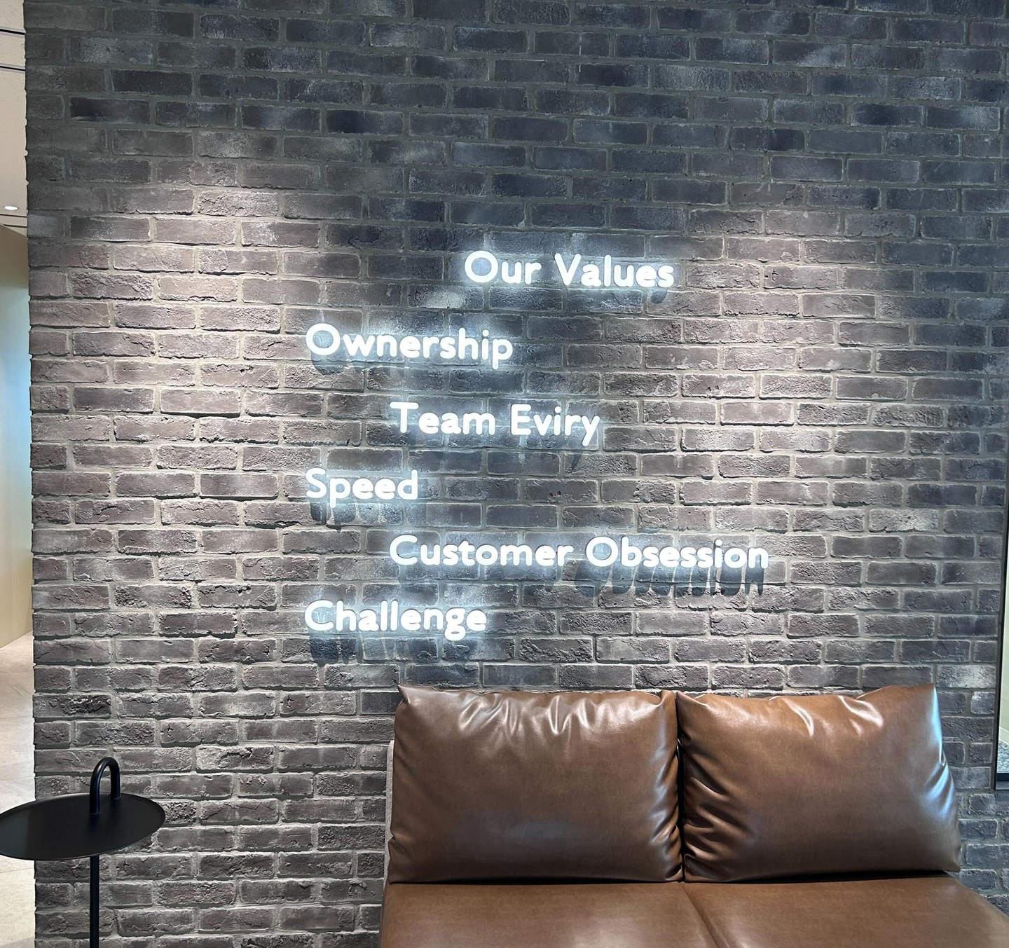 全部で6つのvalue(行動指針)があり、オフィスの壁に明るく照らされています✨