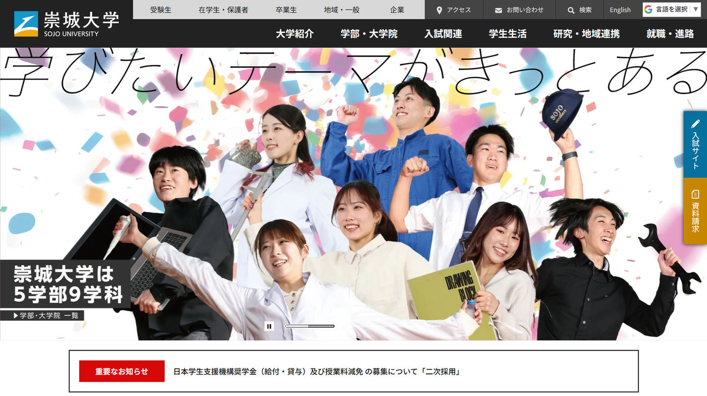 当サイトは2020年、使いやすさの観点から大学のスマホ・サイトを評価する「大学スマホ・サイト ユーザビリティ調査(日経BPコンサルティング主催)」において、全国3位にランクインしました🏆