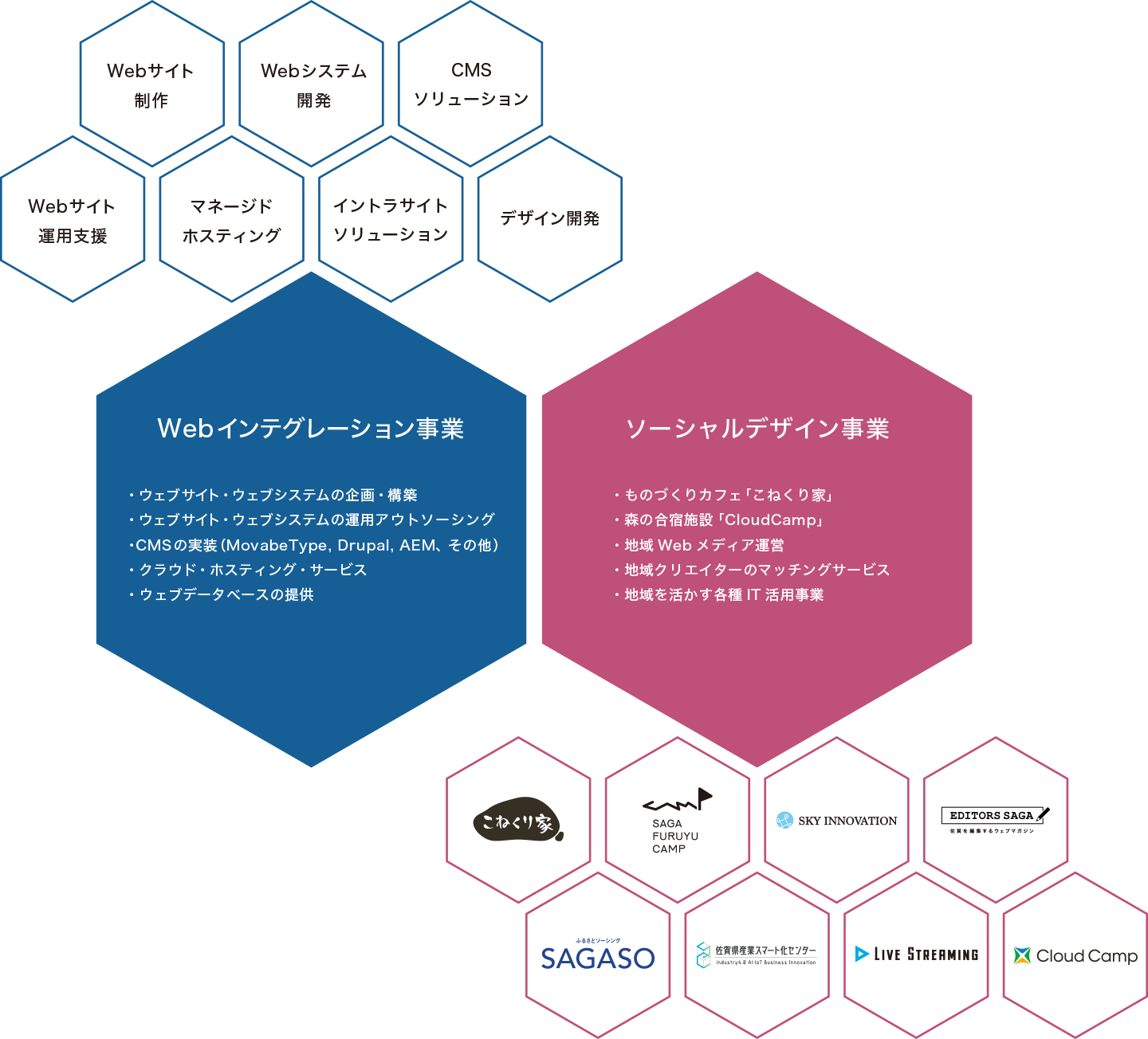 弊社の主軸事業「Webインテグレーション事業部」ですが、東京と佐賀・福島を結ぶニアショアスタイルで、Webマーケティングや企画、デザイン、システム開発から、セキュリティサービスの制作、構築、運用までワンストップで提供しています。