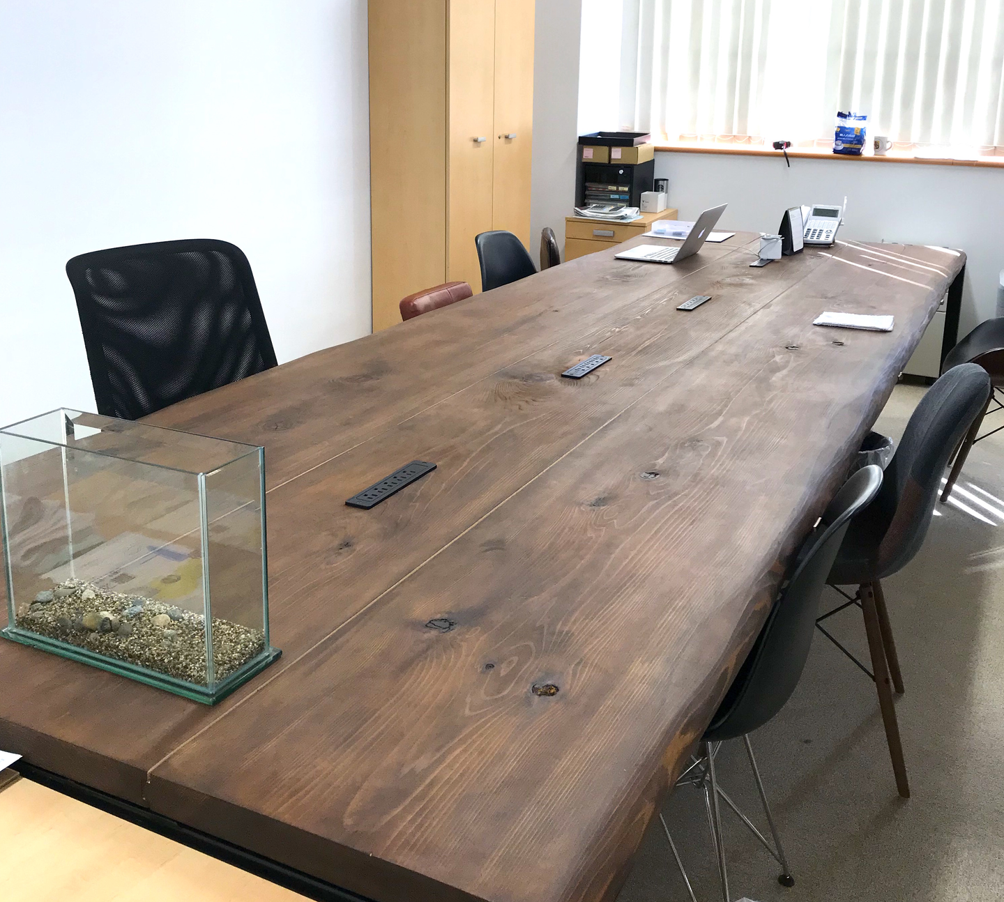 電源タップなども埋め込み、利便性の高いデスクとなりました。ひとつのテーブルに集まることで、自然と会話が生まれます。