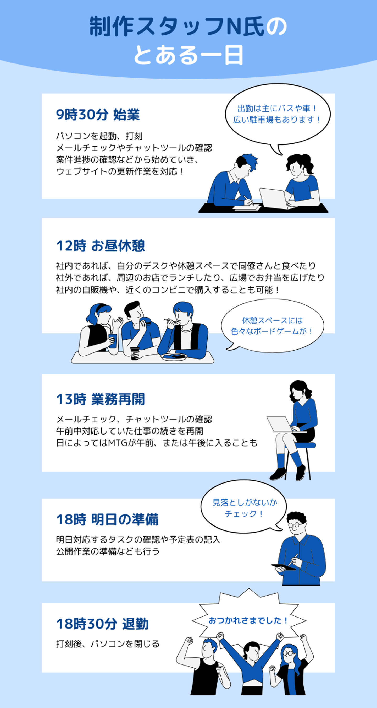 では!こんどは会社で過ごす私たちの一日の流れを詳しくご紹介していこうと思います。