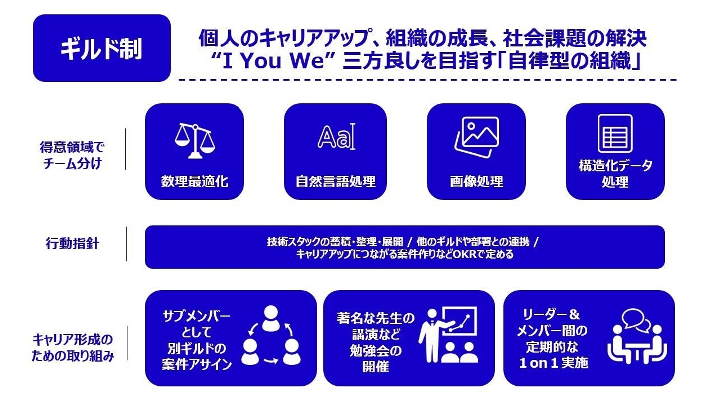 こうした課題を解決し、規模が大きくなってもフラットかつスピーディに動けるよう「ギルド制」を取り入れました。