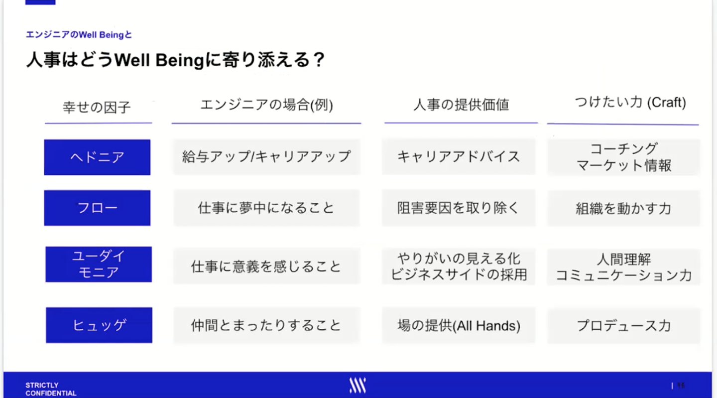 ヘドニア領域では、キャリアづくりのために、アドバイスや会社、仕事とのマッチング機会を設ける。フロー領域では、エンジニアが仕事に没頭できる環境の提供。それに向けた経営陣との交渉。ユーダイモニア領域では、エンジニアの仕事の結果が世間に与えたインパクトを伝える。仕事の成果が見える仕組みをつくれる人の採用も当てはまるかもしれません。ヒュッゲ領域では、エンジニア同士がコミュニケーションできる場を作る。エクサウィザーズの場合は、ピッチ大会の企画などをしていました。